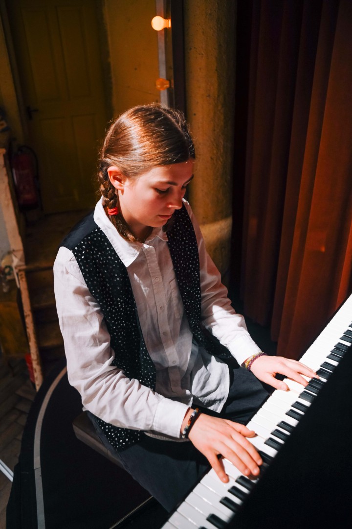 Eine junge Frau mit Mittelscheitel und Zöpfen sitzt hoch konzentriert am Klavier und spielt. Sie trägt ein weisses Kragenhemd, darüber ein schwarzes Gillet mit feinen Glitzertupfen.