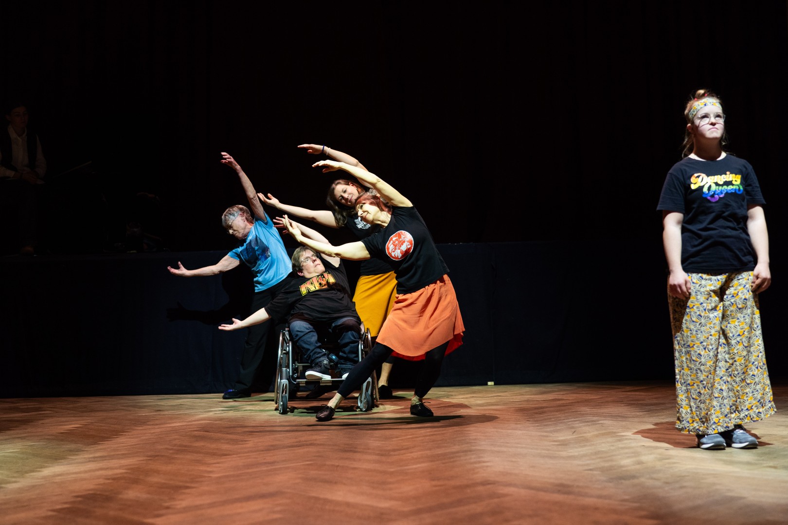 Allein steht eine junge Frau mit Trisomie 21 vorne rechts auf der Bühne, ihr Blick ist in die Ferne gerichtet. Auf ihrem T-Shirt steht Dancing Queen geschrieben. Drei stehende Frauen und eine Frau im Rollstuhl wiegen links, im Hintergrund ihre Körper mit gehobenen Armen weich zur Seite.