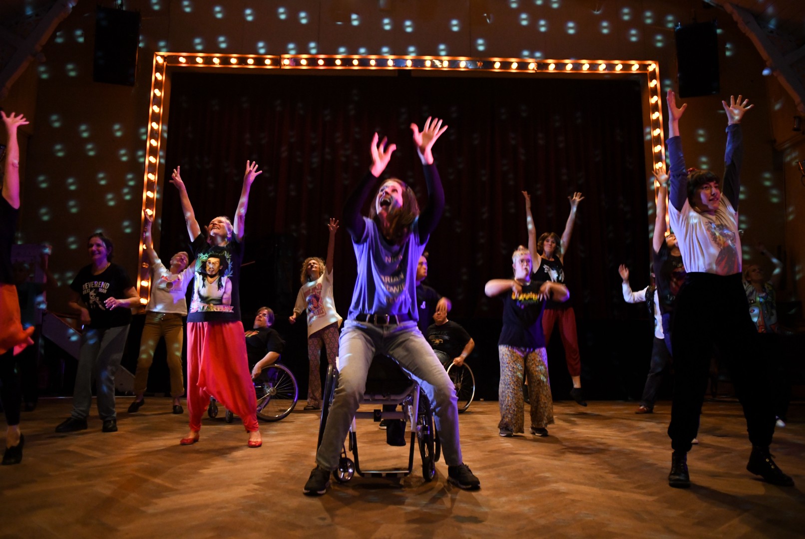 Vor einem altmodischen Bühnenportal aus gelben Glühbirnen tanzt eine Gruppe von Menschen mit und ohne Behinderungen. Verteilt auf dem hellen Holzparkett strecken sie sich ekstatisch in die Höhe. Alle tragen unterschiedliche T-Shirts von Musikerinnen und Musikern oder Bands.