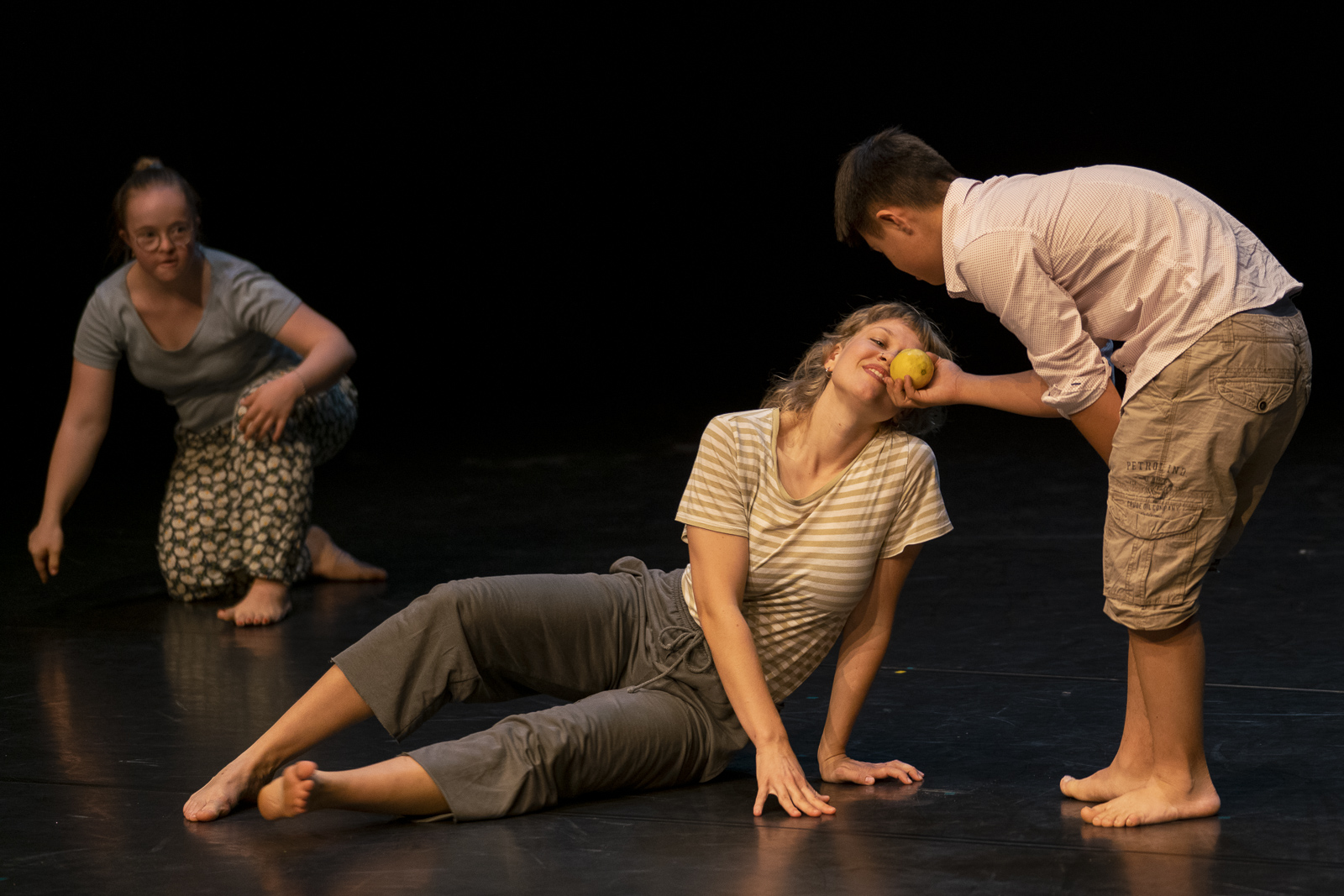 Bühnenaufnahme des Stückes Milles Sens. Ein jugendlicher Tänzer mit Trisomie 21 bückt sich und hält einer seitlich sitzenden jungen Tänzerin eine Zitrone entgegen. Sich sinnlich zuwendend riecht diese genüsslich daran.