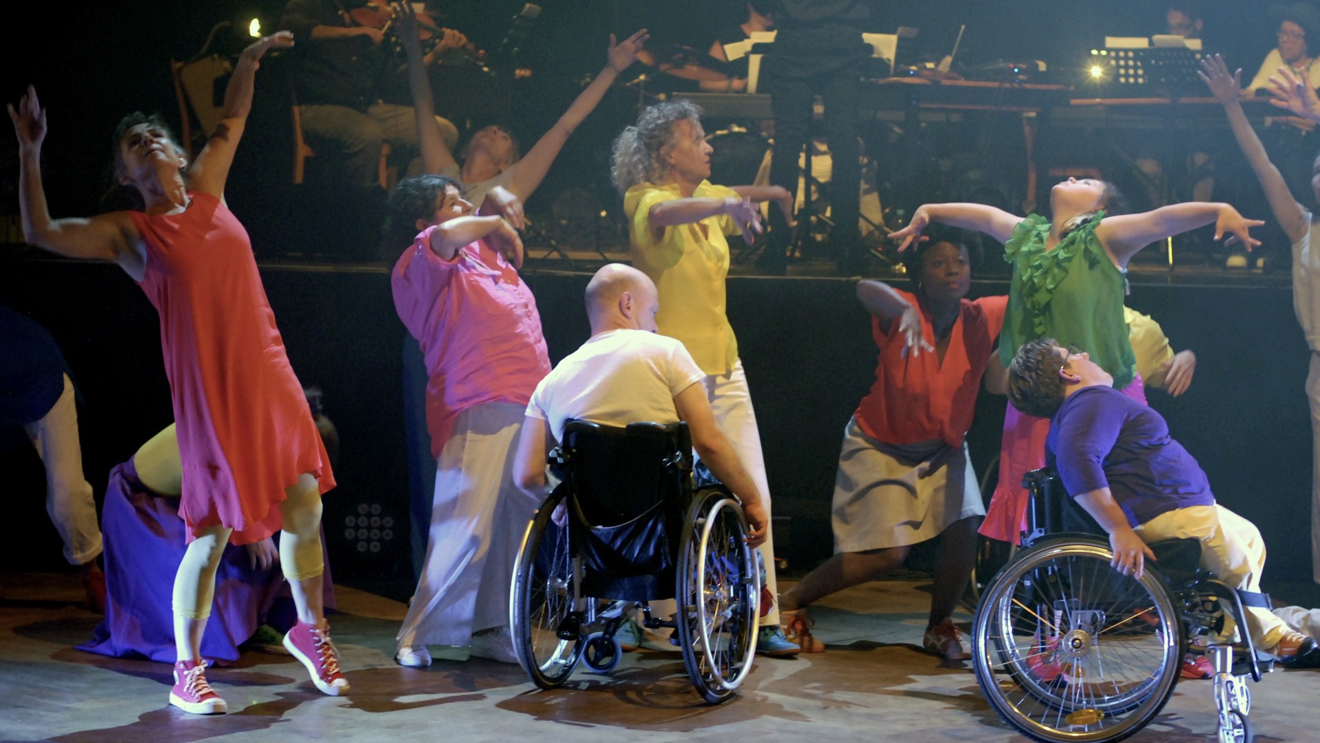 Vorstellungsfoto von «Sinfolie». Unterschiedlich alte, mehrheitlich weissen Menschen mit und ohne Behinderungen tanzen ausgelassen. Alle tragen Alltagskleider in kräftigen Unifarben. Im hellen Bühnenlicht strecken einige ihre Armen in die Höhe, andere biegen sich tief kauernd zu Boden. Zwei fahren kurvend in Rollstühlen, während sie weich den Oberkörper biegen. Auf der erhöhten Bühne hinter ihnen spielt das Tabula Musica Orchester. Foto: Anne Steudler