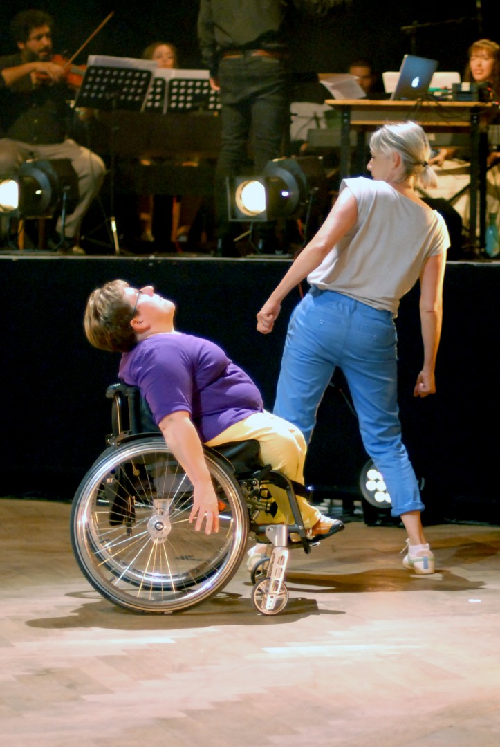 Vorstellungsfoto von «Sinfolie». Zwei weisse Frauen tanzen leicht versetzt nebeneinander vor einer erhöhten Bühne. Die Tänzerin vorne links im Rollstuhl sitzt im Profil nach rechts gewandt. Sie hat ihr Gesicht zur Decke gehoben. Rechts, hinter ihr steht breitbeinig, abgewandt die zweite Tänzerin. Den Oberkörper weiter weg lehnend, blickt sie zurück zur vorderen Tänzerin. Auf der Bühne spielt Tabula Musica Orchester. Ganz links sitzt ein bärtiger Geiger. Vorgelagert rechts steht der Dirigent. Hinter ihnen sitzen weitere Musizierende mit Notenständern. Foto: Anne Steudler