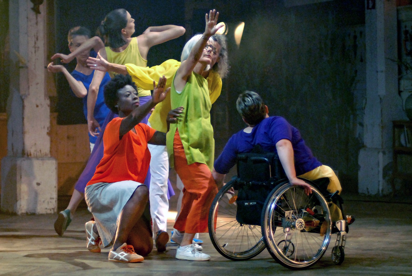 Vorstellungsfoto von «Sinfolie» in der Heiteren Fahne in Wabern. Sechs hell beleuchtete Tänzerinnen bilden von links nach rechts eine überlappende Reihe. An der Spitze blickt eine Tänzerin im Rollstuhl abgewandt zurück. Der Rest der Gruppe hinter ihr befindet sich in verschiedenen Positionen: Stehend, kniend und sich wendenden, mit scharf angewinkelte oder ausgestreckten Arme in unterschiedliche Richtungen. Foto: Anne Steudler
