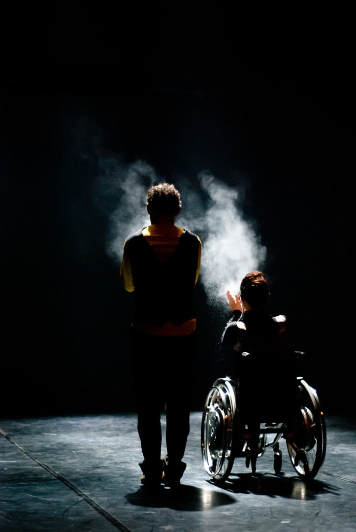 Bühnenaufnahme. Starkes Rücklicht umreisst die Silhouette eines abgewandt stehenden Mannes und einer Frau im Rollstuhl. Ein weisse Staubwolke löst sich hinter ihnen. Fotos: Luca Pillonel & Christian Glaus
