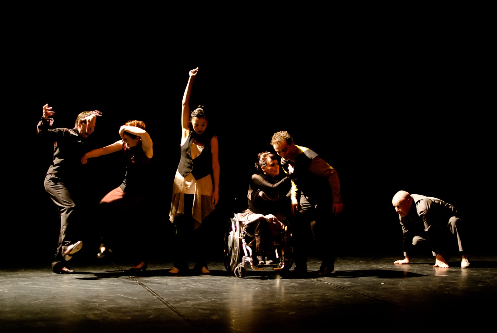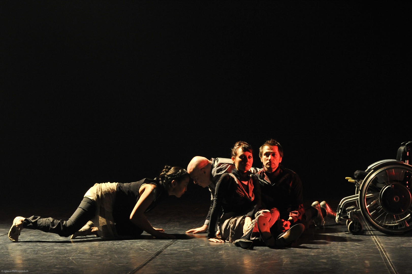Bühnenaufnahme. Ein gemischtes Quartett sitzt und kriecht auf dem Boden in einem länglichen Lichtfleck. In Silhouette beleuchtet sind eine Frau mit langen schwarzen Haaren und ein kahlköpfiger Mann, Stirn an Stirn, auf allen Vieren kriechend. Rechts daneben sitzen eine Frau mit hochgesteckten Haaren und ein Mann neben einander am Boden. Weiter neben ihnen steht ein leerer Rollstuhl. Fotos: Luca Pillonel & Christian Glaus