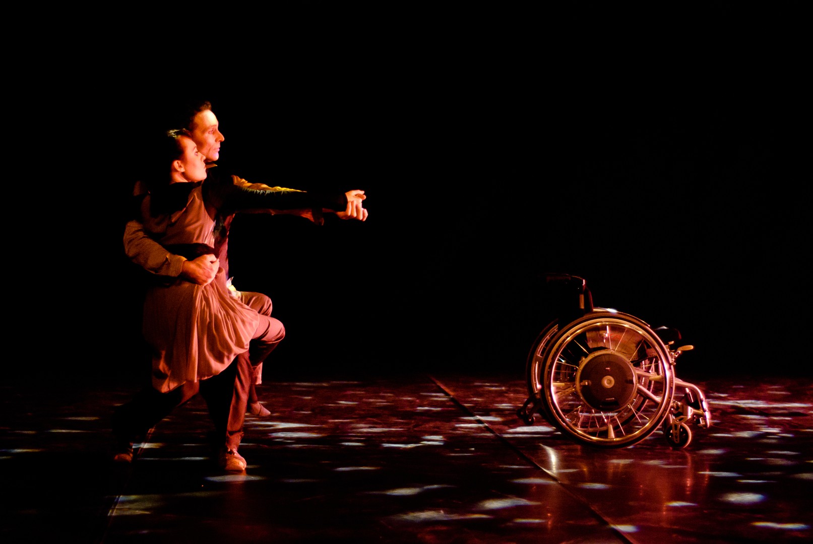 Bühnenaufnahme. Ein Paar steht im Profil in einer Tangoposition. Die Frau balanciert seitlich sitzend auf den Oberschenkeln ihres stehenden Tanzpartners. Rechts von ihnen steht ein leerer Rollstuhl. Fotos: Luca Pillonel & Christian Glaus