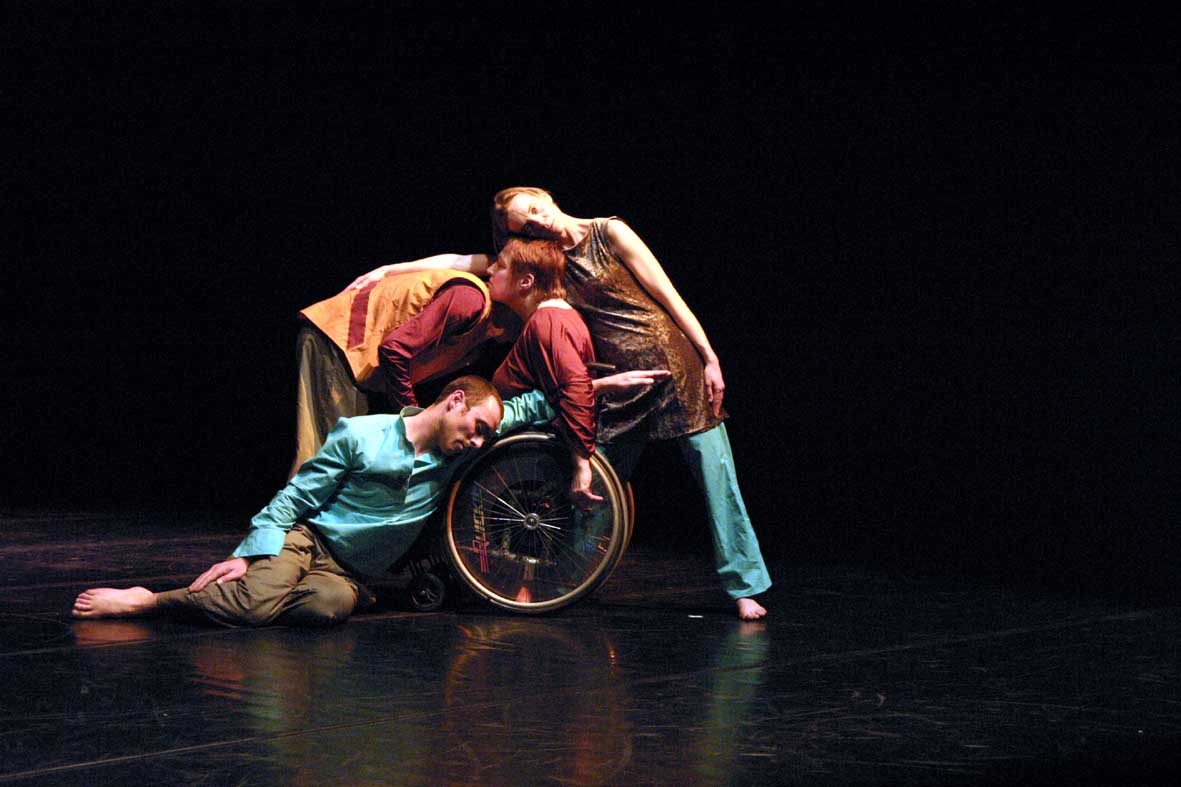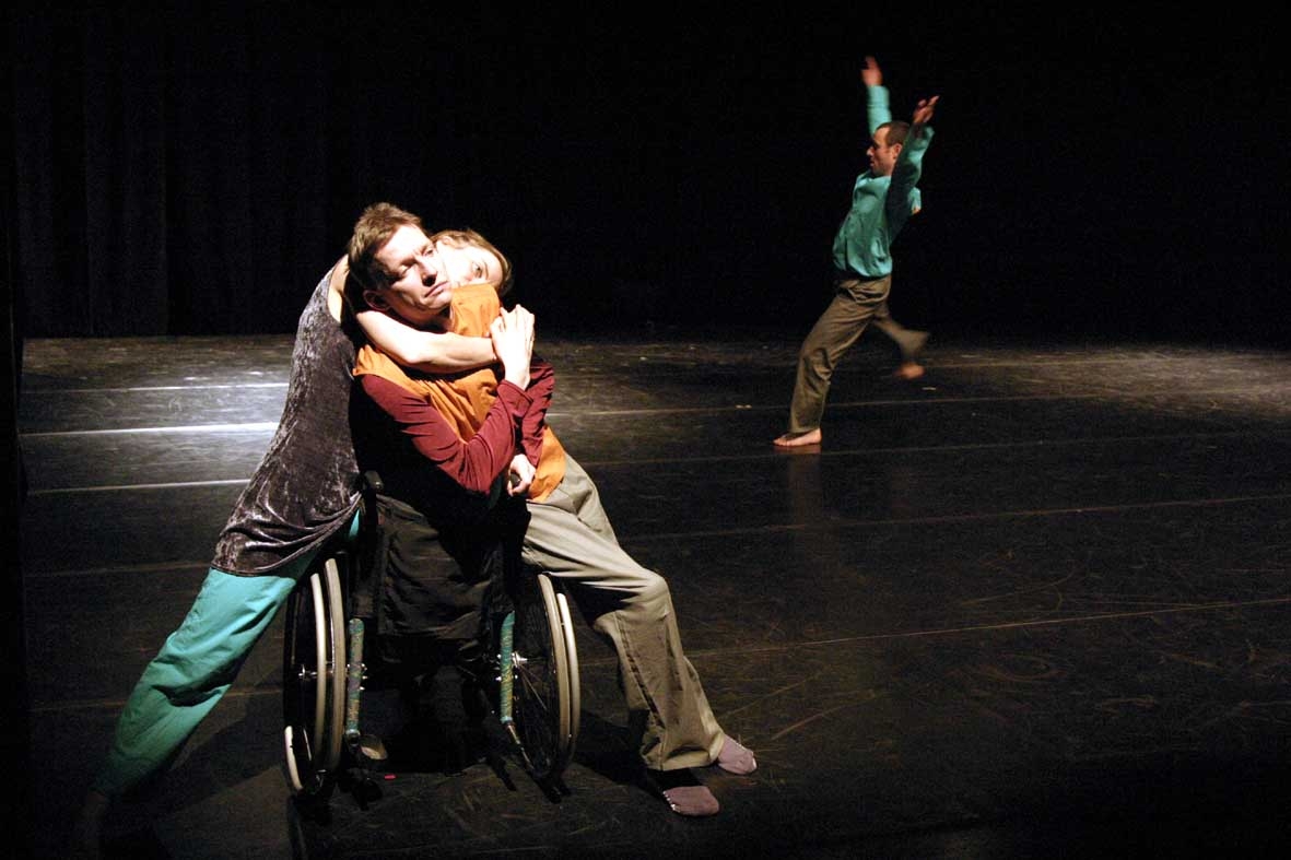 Bühnenaufnahme. Im Vordergrund sitzt ein Tänzer seitlich auf dem Rollstuhl, eine andere Tänzerin umarmt ihn von hinten. Die Gesichtszüge sind entspannt und ernst, im Hintergrund tanzt ein Tänzer mit den Armen in der Höhe.