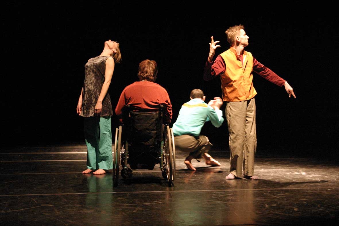 Vier Personen stehen auf der Bühne, im Vordergrund eine Person im Rollstuhl, den Rücken dem Zuschauer zugewandt, rechts ist ein Tänzer in bunter Kleidung, links eine Frau, den Himmel betrachtend, im Hintergrund ein Mann in Hocke, die Knie ineinander verflochten.