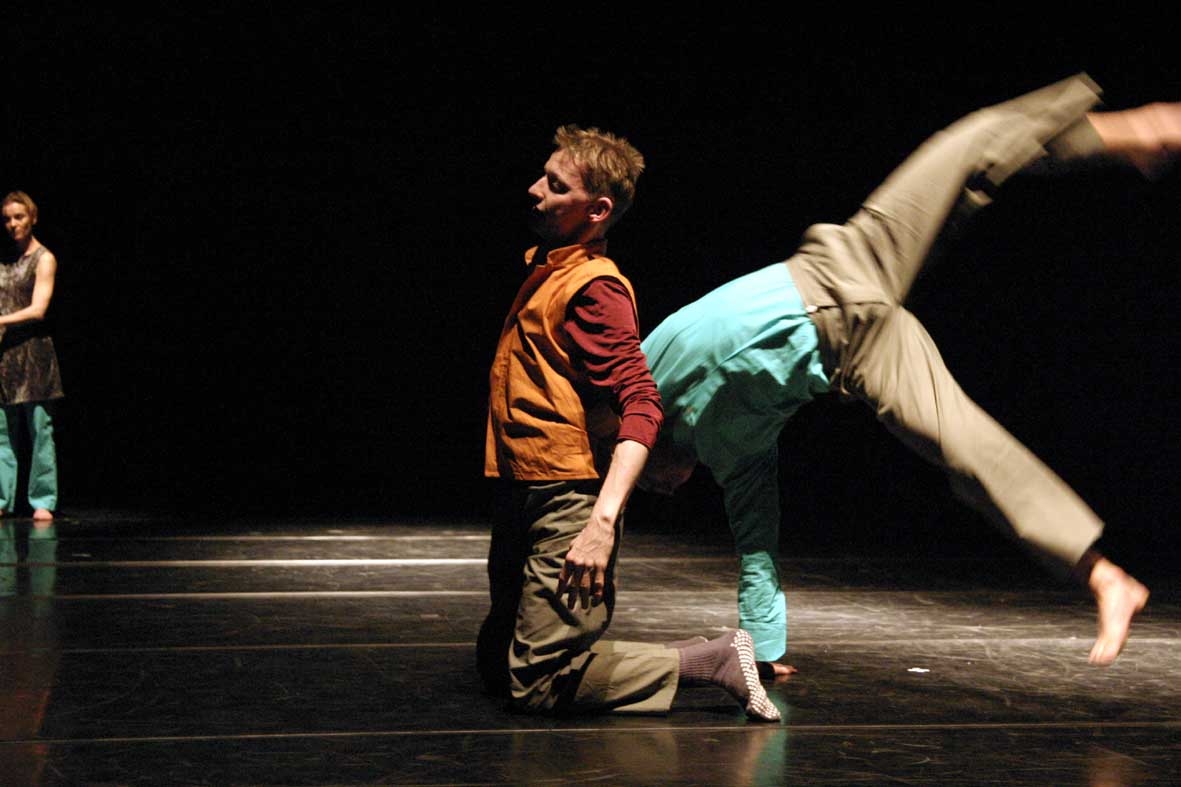 Die Bühne ist spärlich beleuchtet, der Hintergrund ist tiefschwarz, im Vordergrund kniet ein Tänzer, rechts von ihm schlägt eine Person ein Rad. Ganz links ist eine Frau stehend sichtbar, aber nur die Hälfte ihres Körpers ist verschwommen zu sehen.