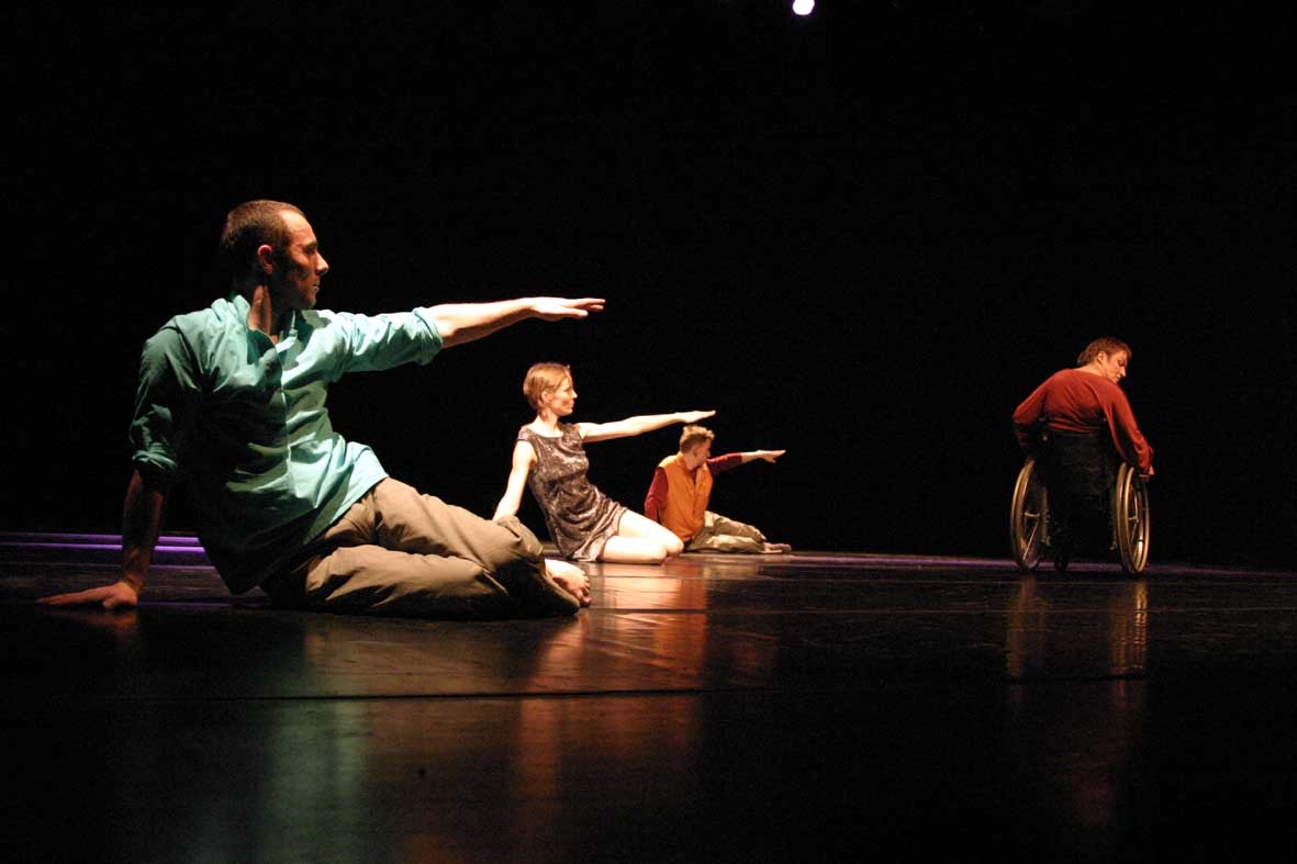 Der Hintergrund der Bühne ist total schwarz, vorne links ein Tänzer, auf dem Boden sitzend, den linken Arm waagrecht nach links ausgestreckt, im Hintergrund versetzt zwei weitere Tänzerinnen und Tänzer in derselben Pose, rechts hinten ein Rollstuhlfahrer mit Rücken zum Zuschauer.