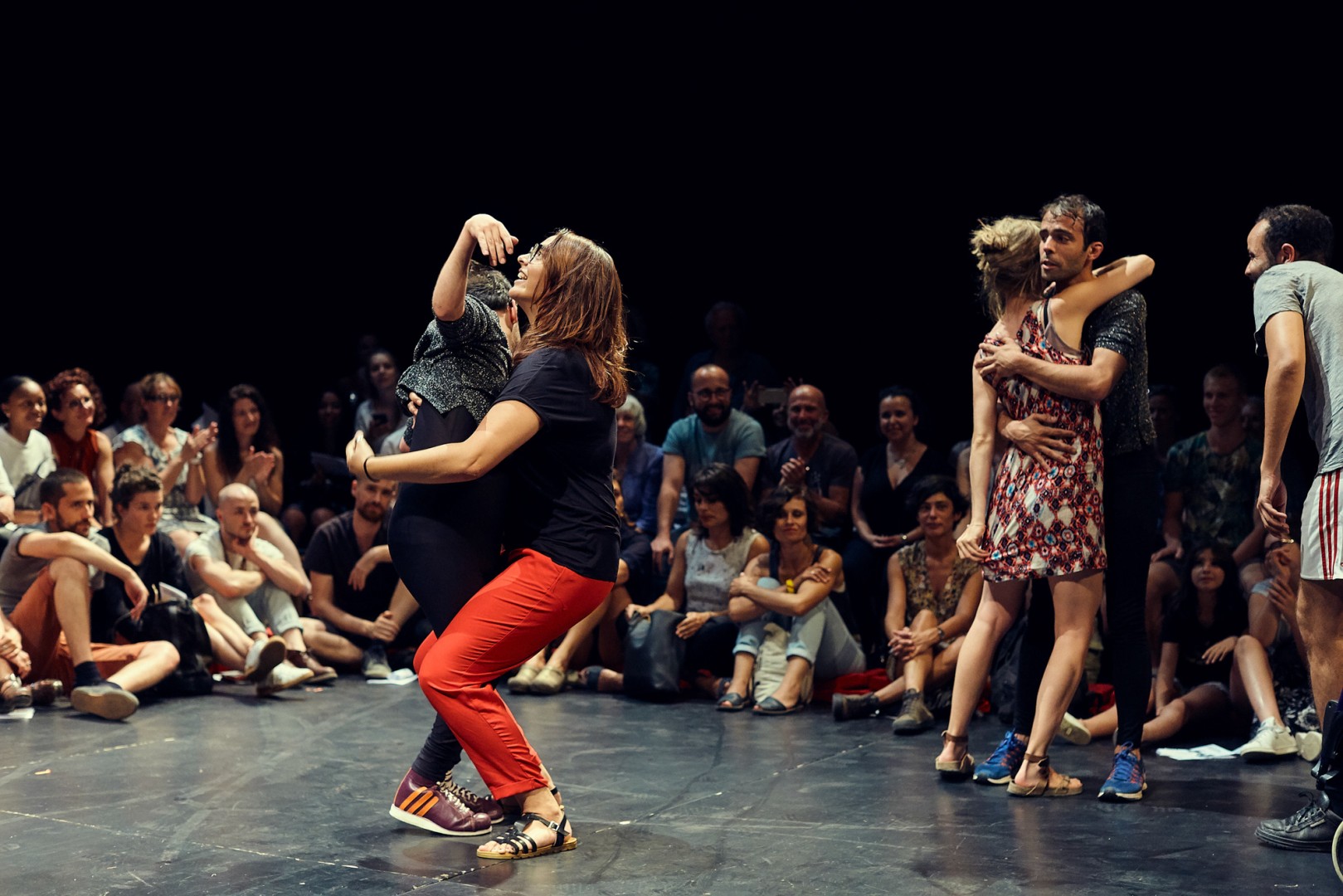 Bühnenbeschreibung. Das Publikum sitzt am Boden im Kreis um zwei tanzende Paare. Ein Paar am Bühnenrand ist eng umschlungen, die Frau hat ihren Arm um den Körper des Mannes gelegt, der ihren Rücken mit beiden Händen an sich drückt und sich in der Umarmung verliert, während sie mit ihrer anderen Hand ihr gemustertes bein- und schulterfreies Kleid etwas nach unten zieht. Ein weiterer Mann nähert sich von der Seite in geduckter Haltung dem Paar. Das zweite Paar in der Bühnenmitte tanzt Bein zwischen Bein, tief gebeugt in offener Umarmung, die nicht hält, sondern mit den Armen den Körper des anderen umspielt. Es ist eine sinnliche und ausgelassene Szene, einige im Publikum begleiten den Tanz der Paare klatschend.