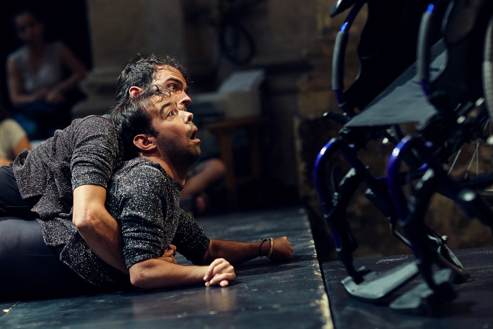 Bild: Baptiste Le QuiniouBühnenbeschreibung. Ein Tänzer liegt auf dem Körper des anderen. Mit beiden Händen umfasst er den Körper des Tänzers unter ihm. Beide Tänzer haben dunkelbraunes mittellanges Haar und tragen die gleiche Kombination eines schwarz-weißdurchsetzten Strickpullovers, der bis oberhalb der Ellenbogen hochgerafft ist und schwarze Leggins. Ihre Kleidung schließt genau mit der Kleidung des anderen ab, wie eine Verdoppelung der Körper. Beide sind im Oberkörper aufgerichtet und starren gebannt nach vorne, während der schräg nach vorne gekippte Rollstuhl droht, von rechts auf sie zu stürzen. Bild: Baptiste Le Quiniou