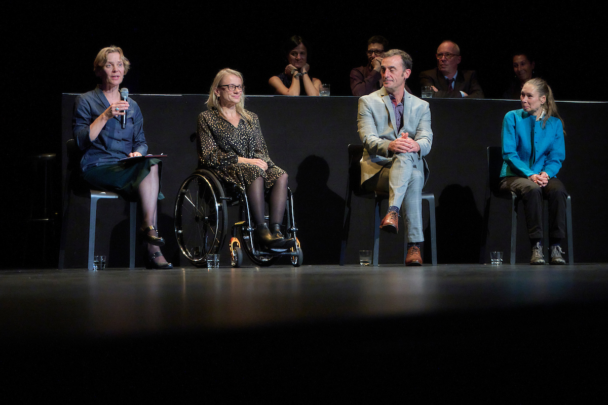 Videoporträt für Schweizer Preis Darstellende Künste 2022. Susanne Schneider und Cornelia Jungo geben in einem leeren Zuschauerraum ein Interview. Dazwischen sieht man sie, wie sie mit Esther Kunz und Jürg Koch durch eine Videoinstallation mit Ausschnitten aus BewegGrund Stücken schreiten.